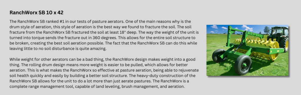 The versatility of the RanchWorx SB model is one of the most attractive features of this aerator. This aerator has not only the ability to aerate but at the same time can clear brush and do land leveling. The drum design allows for a much heavier unit to be pulled with less horsepower and still do a betting job of soil fracturing than other aeration styles.